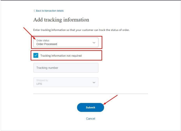 4. Выберите: Order Status = Order Processed / Completed и Tick box = Tracking information not required (информация для отслеживания не требуется), затем нажмите на кнопку “Submit”.